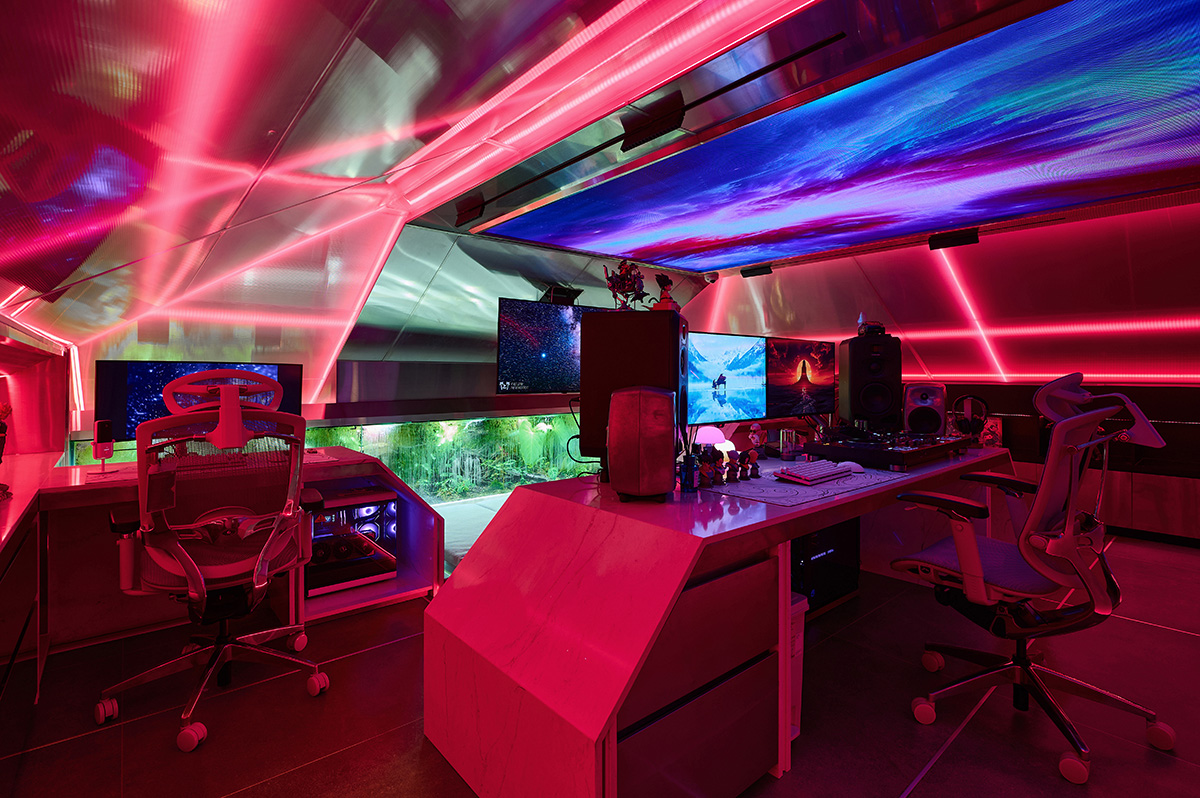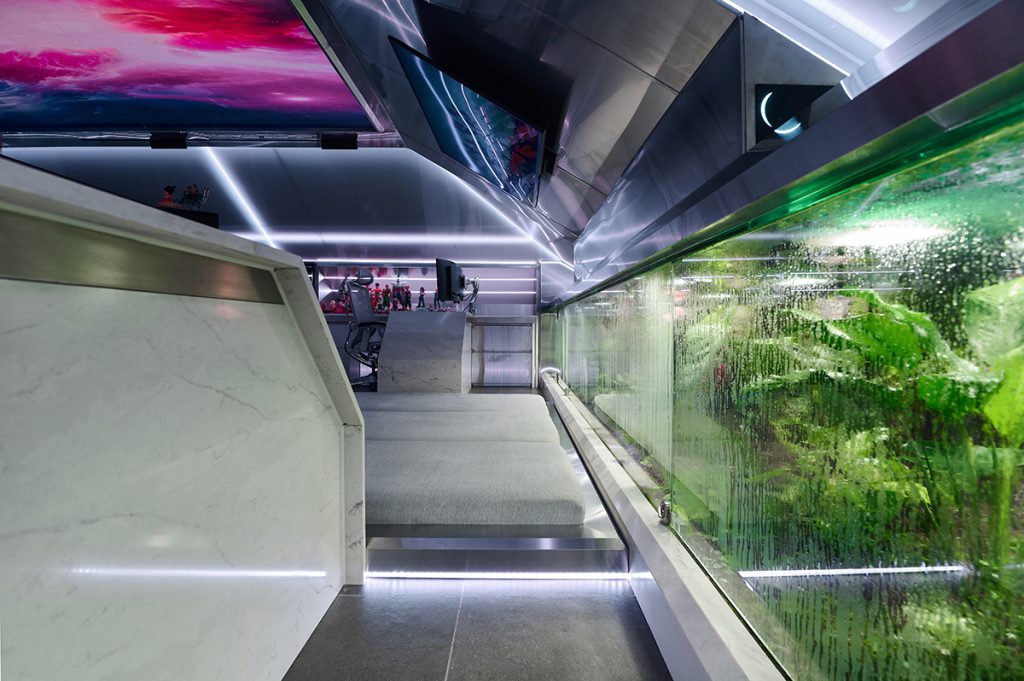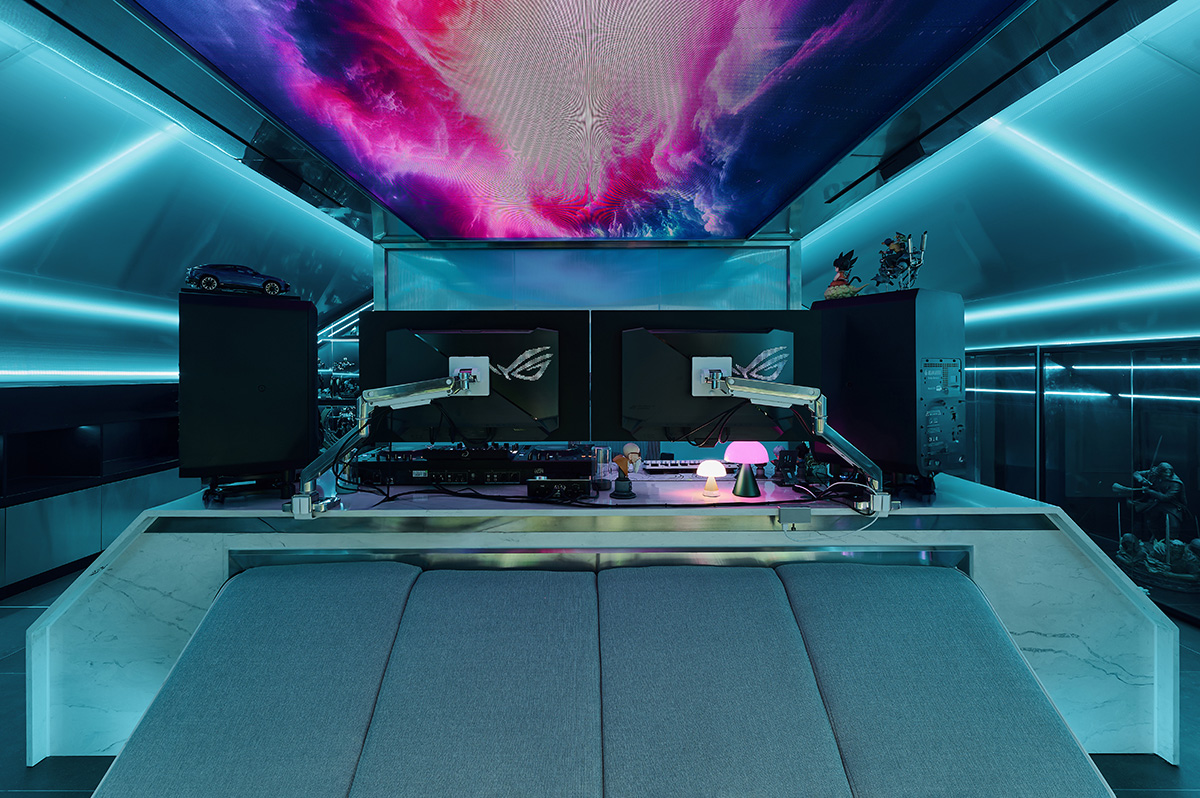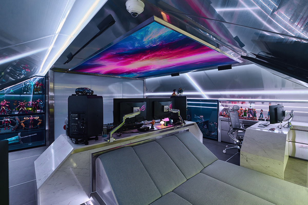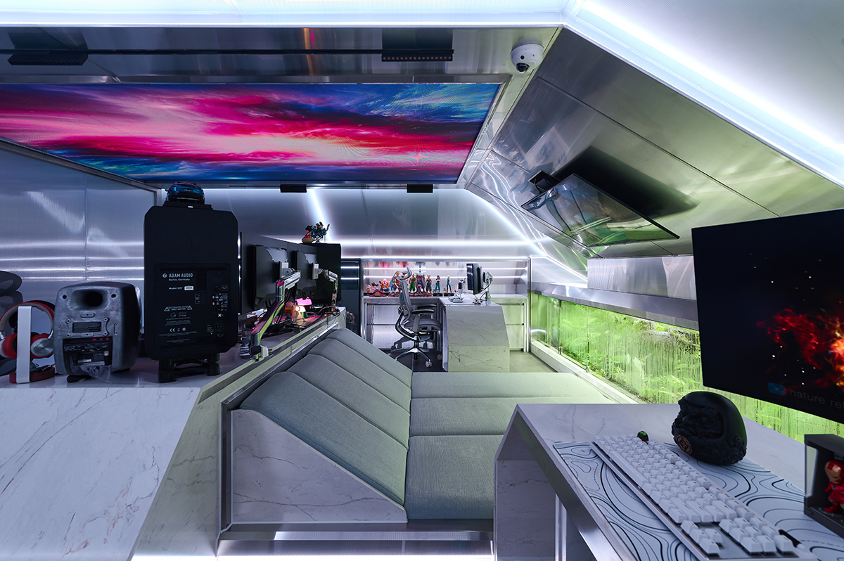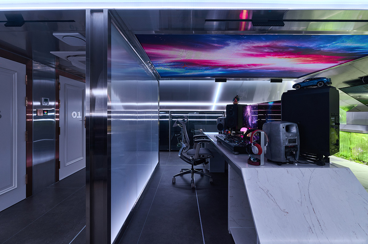 Tất cả được đồng bộ qua hệ điều khiển thông minh liên kết với màn hình LED trần, cho phép mô phỏng bối cảnh và thiết lập nhiều chế độ hoạt cảnh từ làm việc đến giải trí.