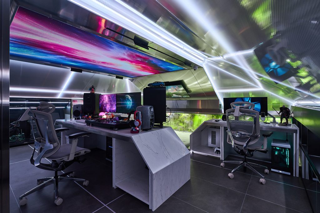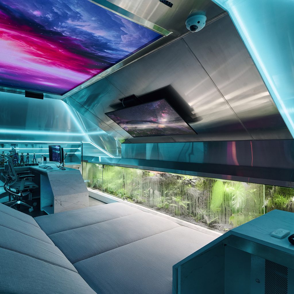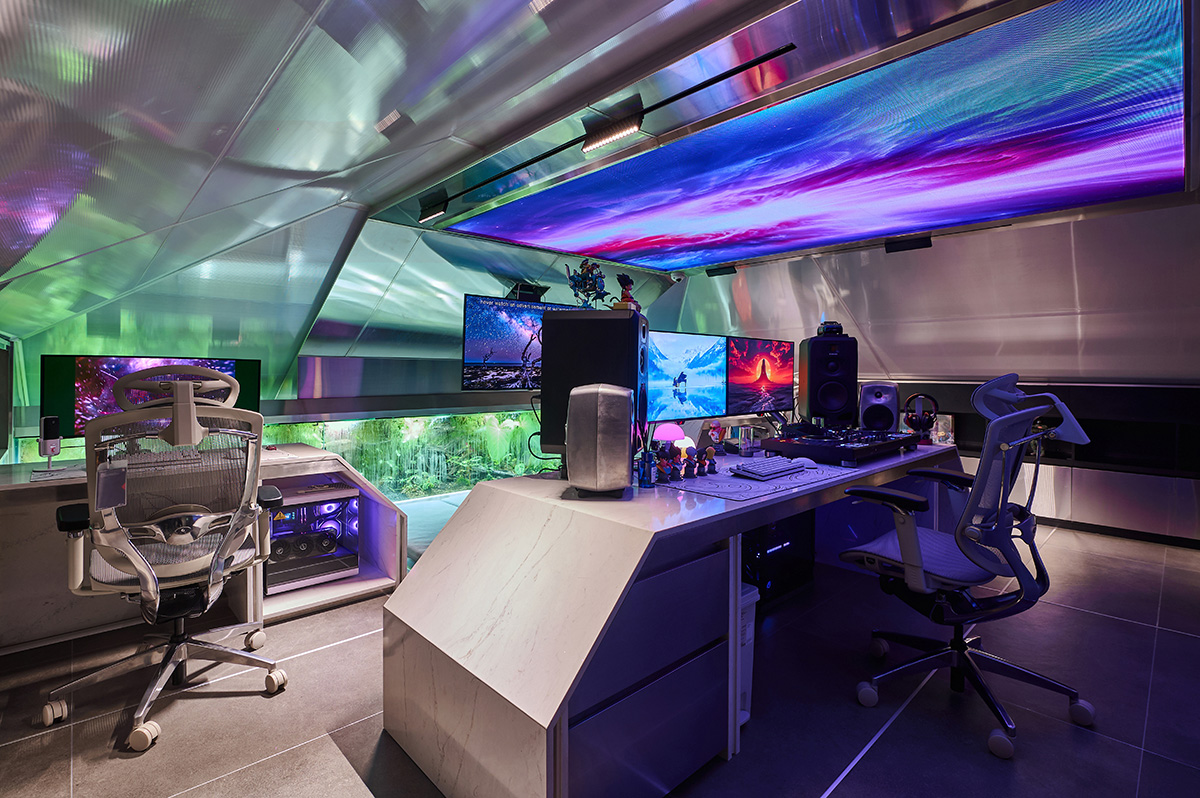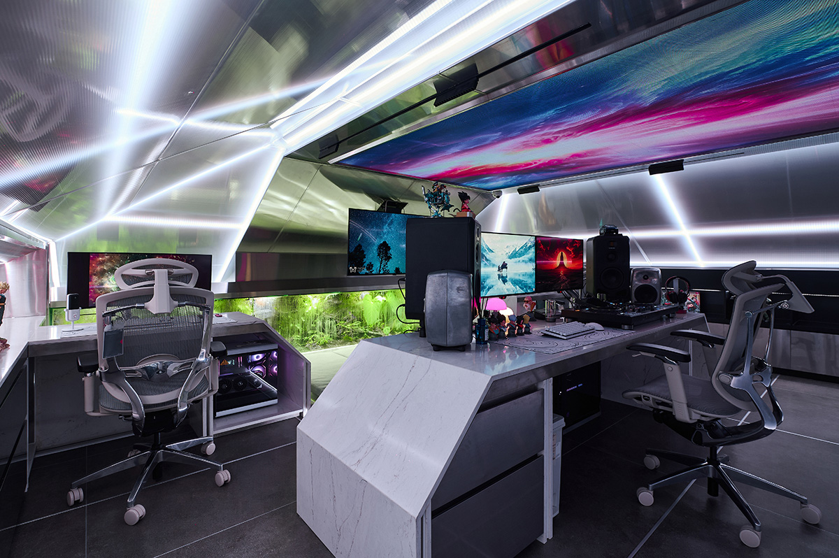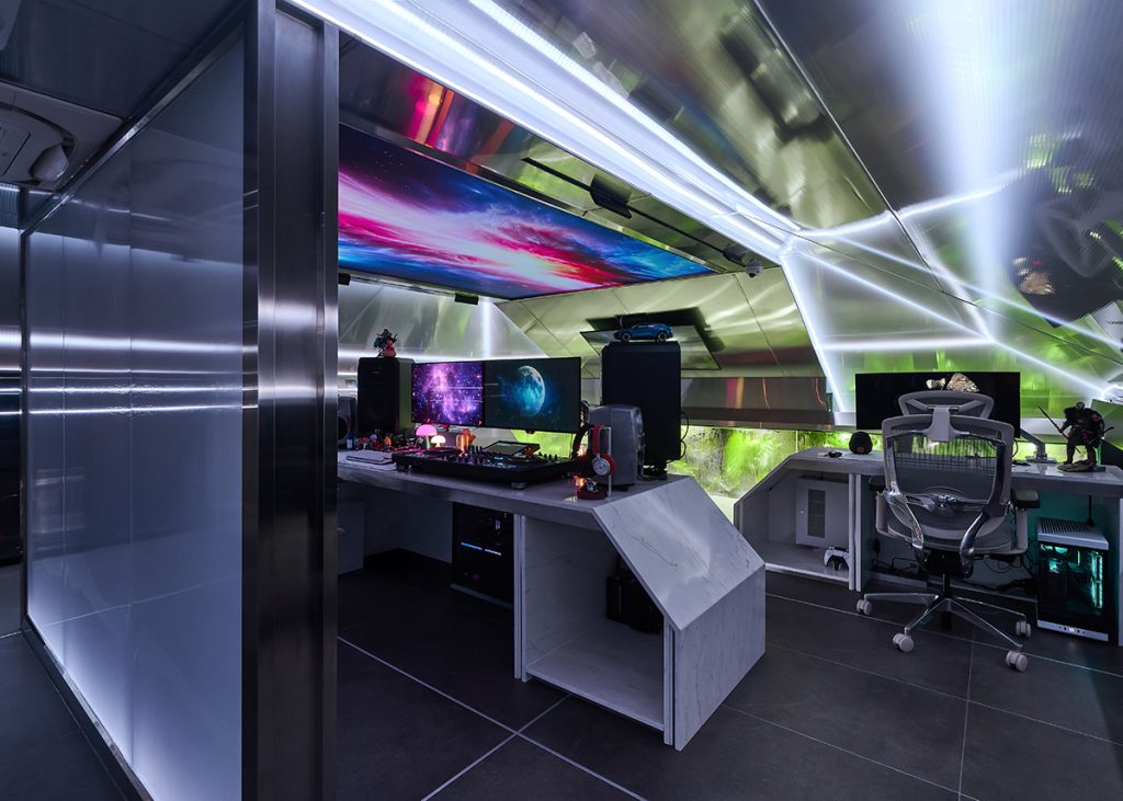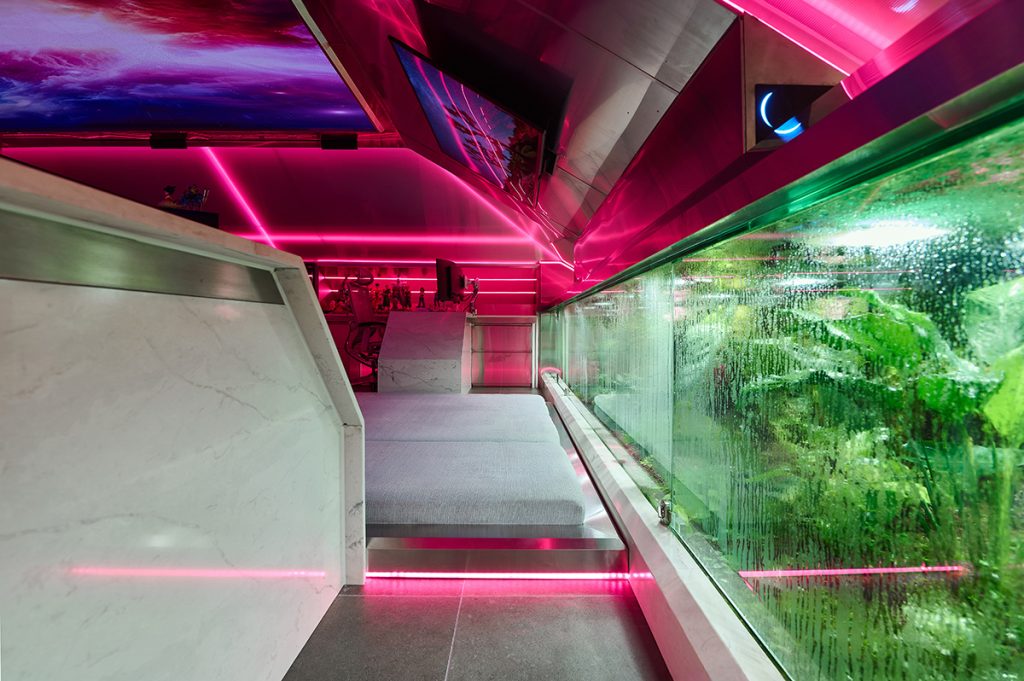 Tất cả được đồng bộ qua hệ điều khiển thông minh liên kết với màn hình LED trần, cho phép mô phỏng bối cảnh và thiết lập nhiều chế độ hoạt cảnh từ làm việc đến giải trí.