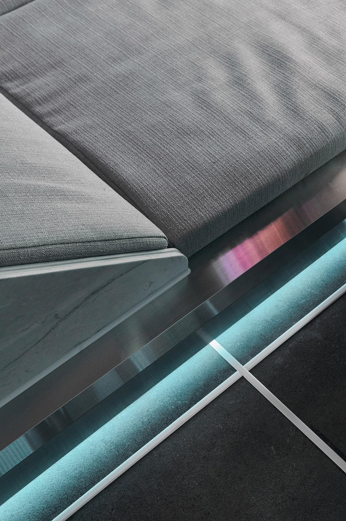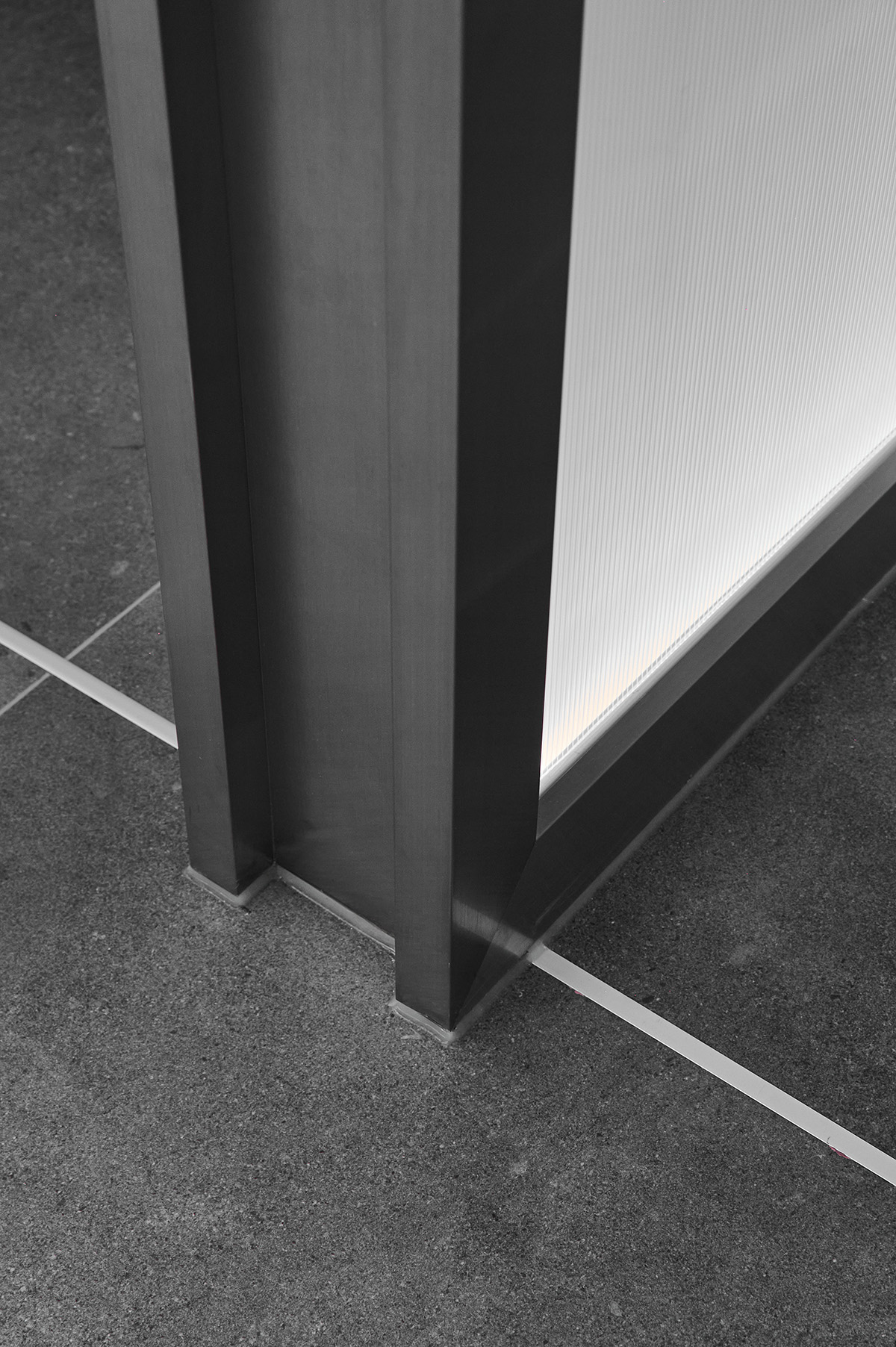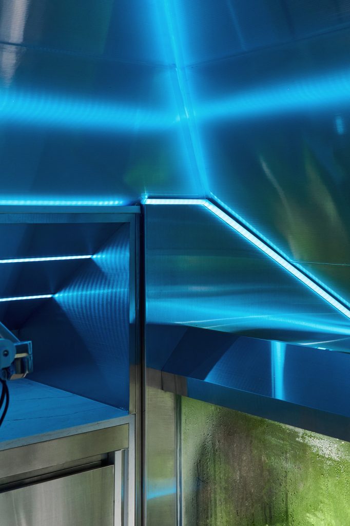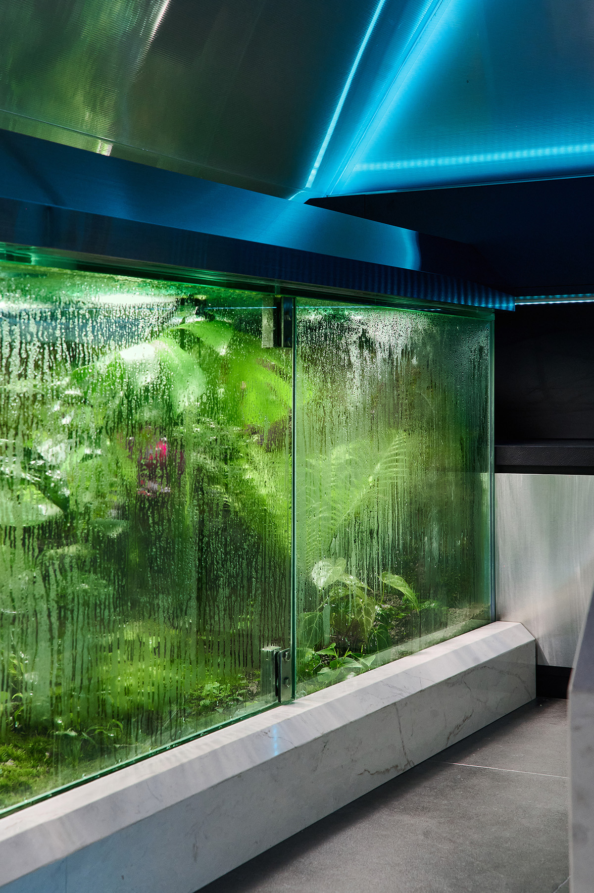 Bảng vật liệu tiết chế gồm đá tự nhiên; thép không gỉ; polycarbonate, kết hợp với hạ tầng kỹ thuật vận hành như trục xương sống cho thấy cách không gian kín này được xem như phòng thí nghiệm của kiến trúc đương đại: nơi giới hạn không còn là trở ngại, mà là tiền đề để kiến trúc, kỹ thuật và cảm xúc được đặt vào cùng một tuyến trải nghiệm liền mạch.