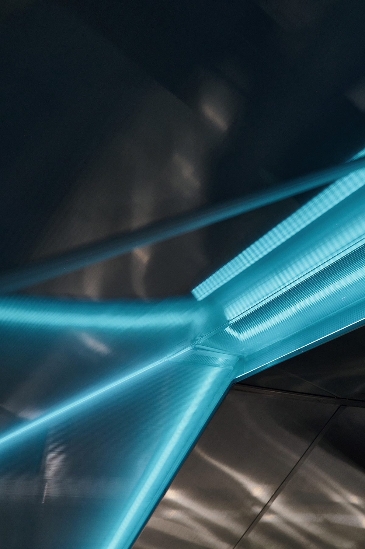 Polycarbonate được khai thác như lớp bao che đa nhiệm: khuếch tán ánh sáng, hấp thụ âm và tham gia kiểm soát mức vọng âm, đây là yếu tố cần thiết cho môi trường không gian của game và âm nhạc.