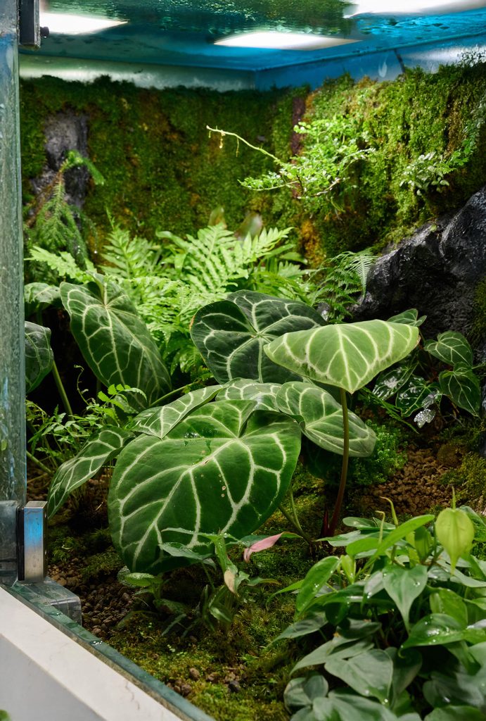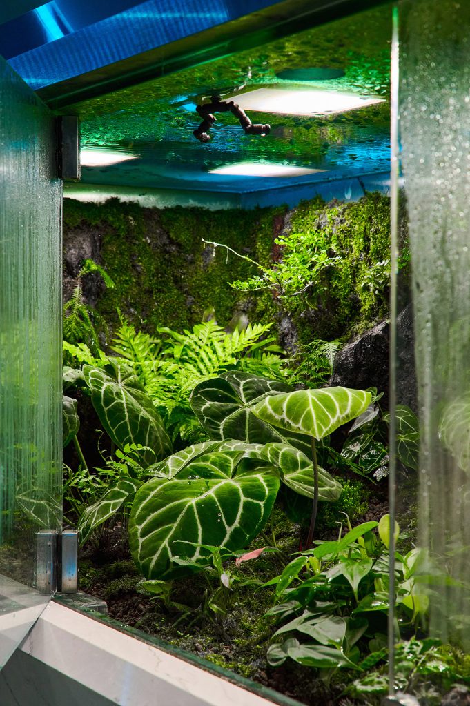 Ở trung tâm, terrarium đóng vai trò là “nhân tố sự sống”, vừa là điểm tựa thị giác, vừa là hệ sinh thái điều tiết bầu không khí trong một không gian nhân tạo. Sự bố trí này tạo ra đối trọng với tính chất kín của lớp vỏ bọc, làm cấu trúc mềm mại và yếu tố sinh học được thêm vào nhịp sinh hoạt hàng ngày.