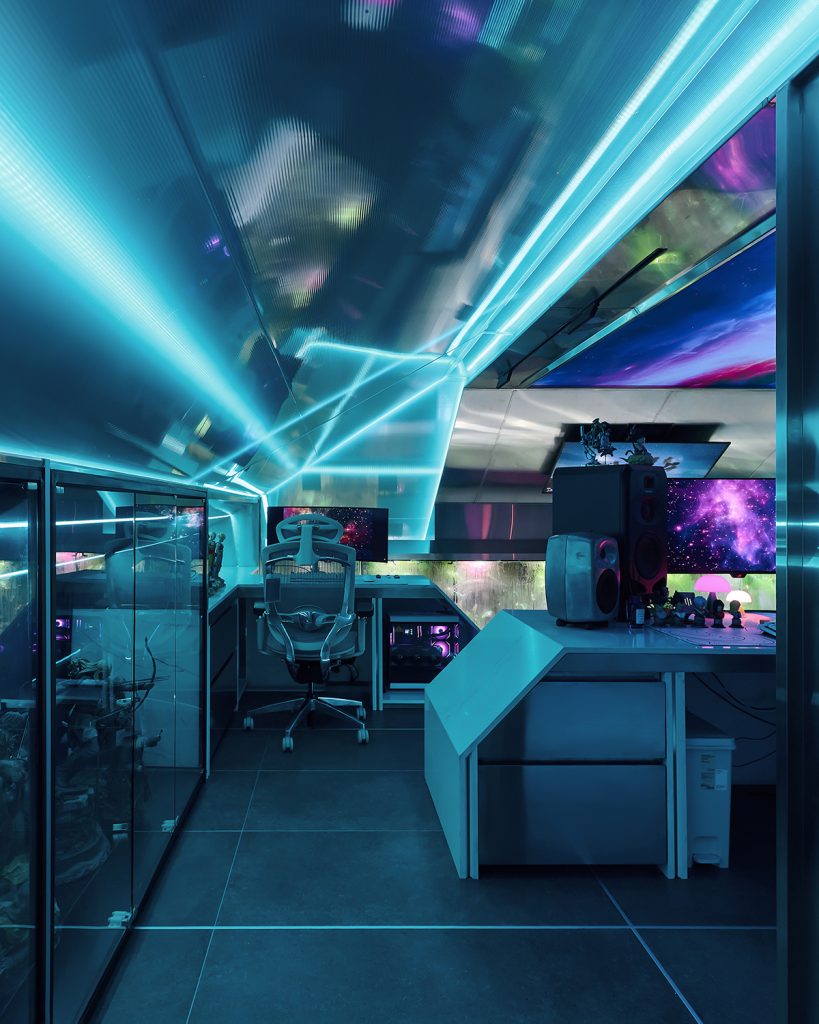 Hệ thống chiếu sáng được phát triển theo ba lớp: – RGB LED tạo nền tảng cảm xúc và các “mã màu” theo kịch bản – Spotlight 4000K cho các tác vụ tập trung – Ánh sáng nền dịu từ terrarium đóng vai trò trung hòa trường nhìn.